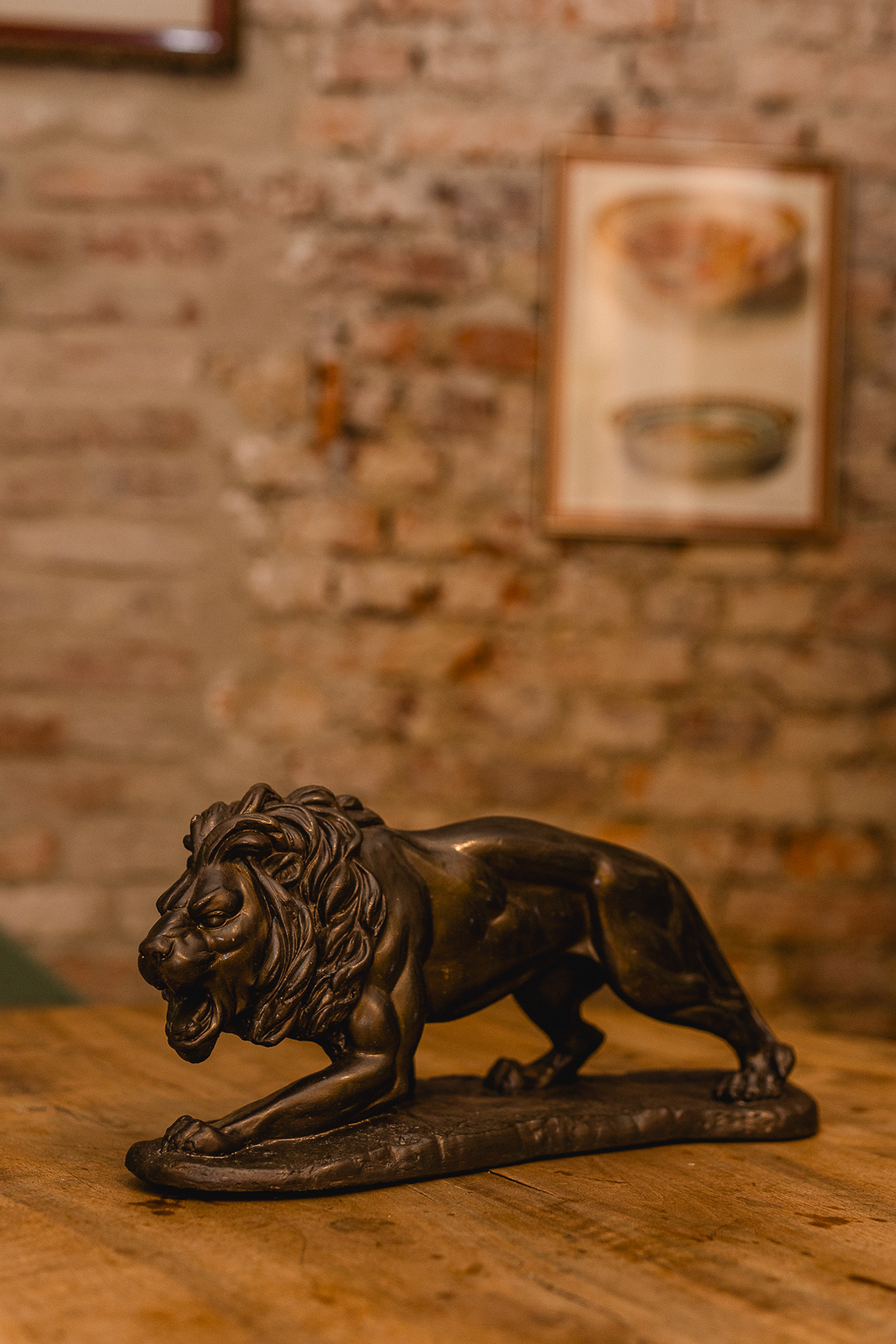 Art-Déco Löwenfigur – bronzierter Gips Länge: 46 cm Diese eindrucksvolle Art-Déco Löwenfigur strahlt Stärke, Dynamik und ästhetische Eleganz aus. Der bronzierte Gips verleiht der Skulptur eine edle Metalloptik und betont die detaillierte Modellierung der Mähne, Muskulatur und Körperhaltung. Die kraftvolle, nach vorne gedrungene Pose des Löwen verleiht dem Stück eine besondere Spannung und Präsenz – ein echter Blickfang in jedem Raum. Mit einer Länge von 46 cm gehört die Figur zu den größeren Dekoobjekten und eignet sich ideal für Sideboards, Kaminabdeckungen oder als markantes Solitärstück in modernen wie klassischen Interieurs. Durch ihren Art-Déco-Charakter fügt sie sich besonders gut in Vintage-, Sammler- und stilbewusste Wohnumgebungen ein. Highlights: Ausdrucksstarke Art-Déco Skulptur Material: bronzierter Gips Große, dekorative Länge von 46 cm Detailreiche Darstellung und dynamische Körperhaltung Stimmungsvolles Dekoobjekt für Wohnzimmer, Büro oder Entrée Ein stilvolles Objekt für Liebhaber dekorativer Kunst und historischer Formensprache.