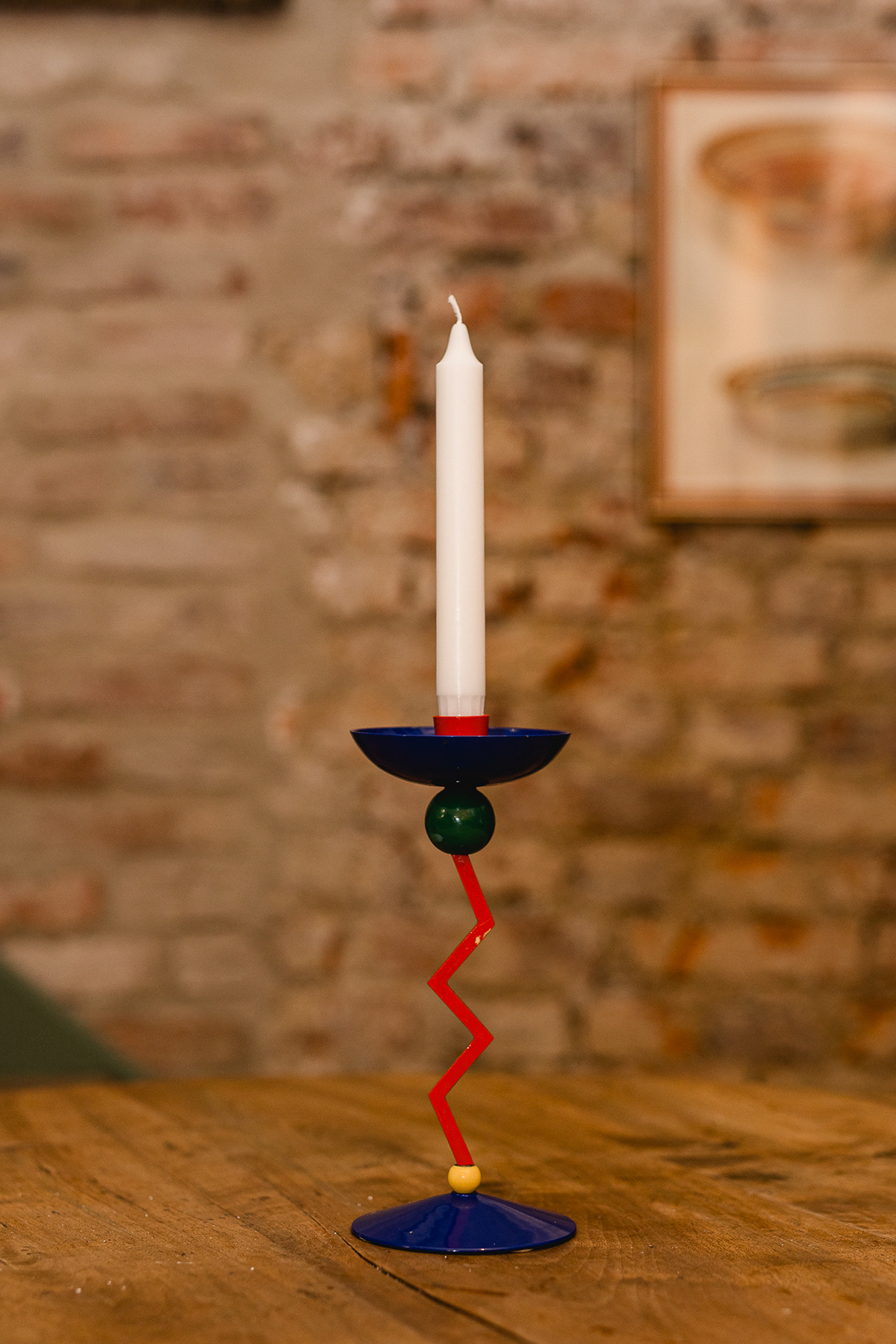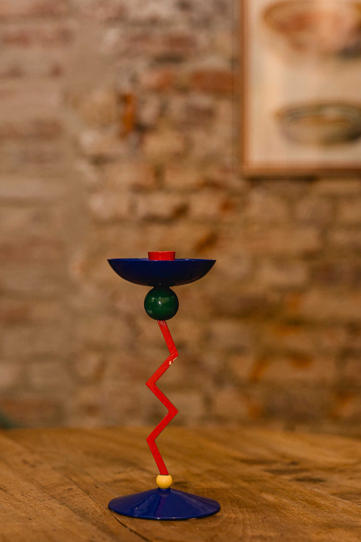 Farben: Blau, Rot, Gelb, Grün Dieser auffällige Kerzenleuchter im Memphis-Stil der 1980er Jahre bringt Pop-Art-Charme und farbenfrohes Design in jedes Interieur. Die markanten Zickzack-Formen und die leuchtenden Primärfarben Blau, Rot, Gelb und Grün sind typische Merkmale der Memphis-Bewegung und machen den Leuchter zu einem echten Statement-Piece. Gefertigt aus Messing, verbindet das Objekt hochwertige Materialität mit verspielter Ästhetik. Ideal als dekorativer Blickfang auf Esstischen, Sideboards oder Regalen – und perfekt für Liebhaber von Retro-Design und kunstvoller Tischdekoration. Highlights: Original Memphis-Stil Kerzenleuchter der 1980er Jahre Material: Messing Auffällige Zickzack-Formen in Blau, Rot, Gelb & Grün Ideal als Dekoration oder Sammlerstück Pop-Art- und Retro-Charme Ein farbenfrohes Accessoire für alle, die Designgeschichte und ausgefallene Deko lieben.
