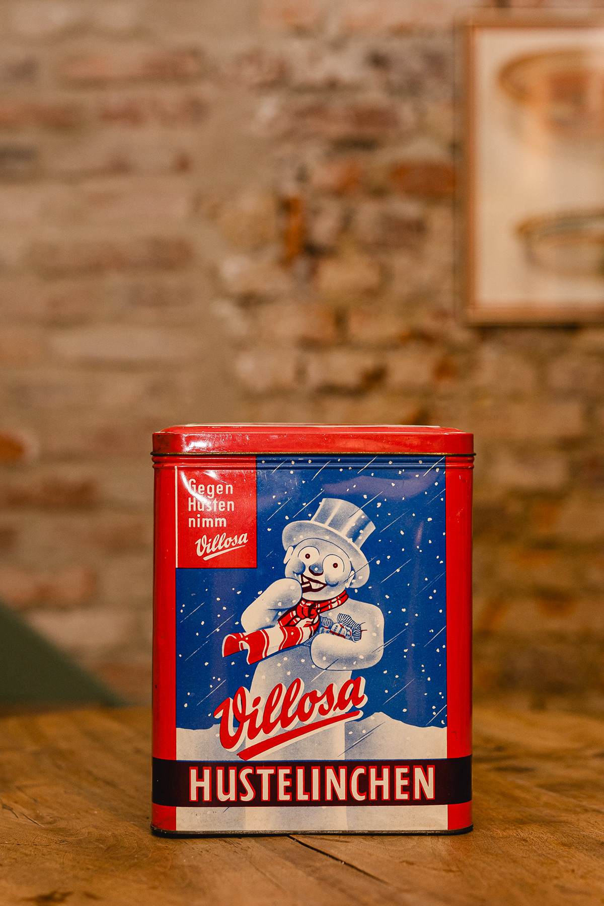 Höhe: 28 cm | Motiv: Schneemann | Farben: Rot & Blau Diese nostalgische Villosa Hustelinchen Blechdose aus den 1950er Jahren ist ein charmantes Sammlerstück für Liebhaber historischer Werbung und Vintage-Dekoration. Die große Dose mit einer Höhe von 28 cm zeigt einen fröhlichen Schneemann in den kräftigen Retrofarben Rot und Blau – typisch für die grafische Gestaltung der Wirtschaftswunderzeit. Die Dose überzeugt durch ihre schöne Patina, den authentischen Charakter und den hohen dekorativen Wert. Ideal als Winter- oder Weihnachtsdeko, für Sammlungen alter Blechdosen oder als auffälliges Vintage-Objekt in Küche, Wohnzimmer oder Verkaufsraum. Highlights: Original Villosa „Hustelinchen“ Blechdose aus den 50er Jahren Großes Format: 28 cm hoch Winterliches Schneemann-Motiv in Rot & Blau Begehrtes Sammel- und Dekoobjekt Perfekt für Retro-, Vintage- und Nostalgie-Liebhaber Ein zeitlos schönes Stück Werbegeschichte mit hohem Charmefaktor.