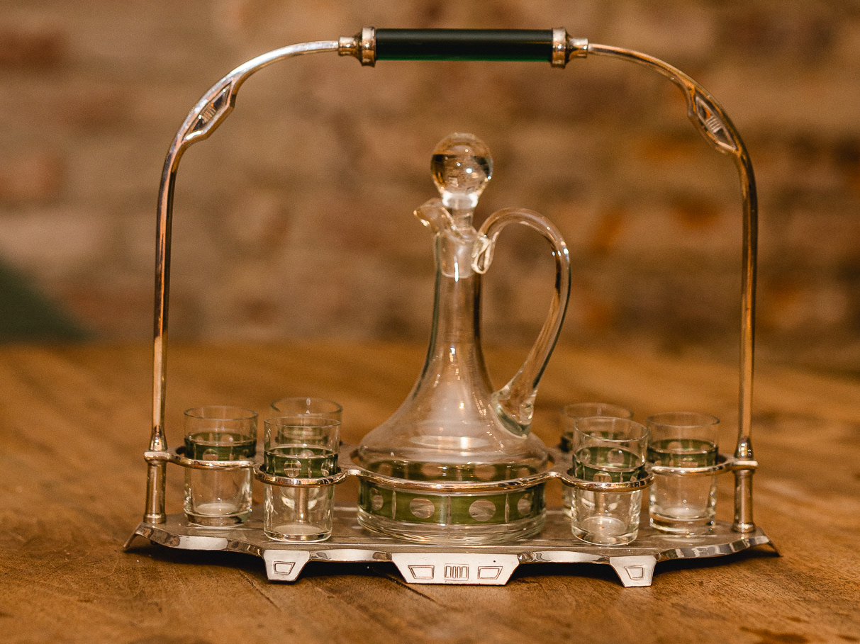 Jugendstil Likör-Set aus Chrom & grünem Glas 64€